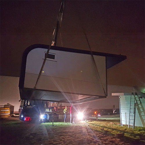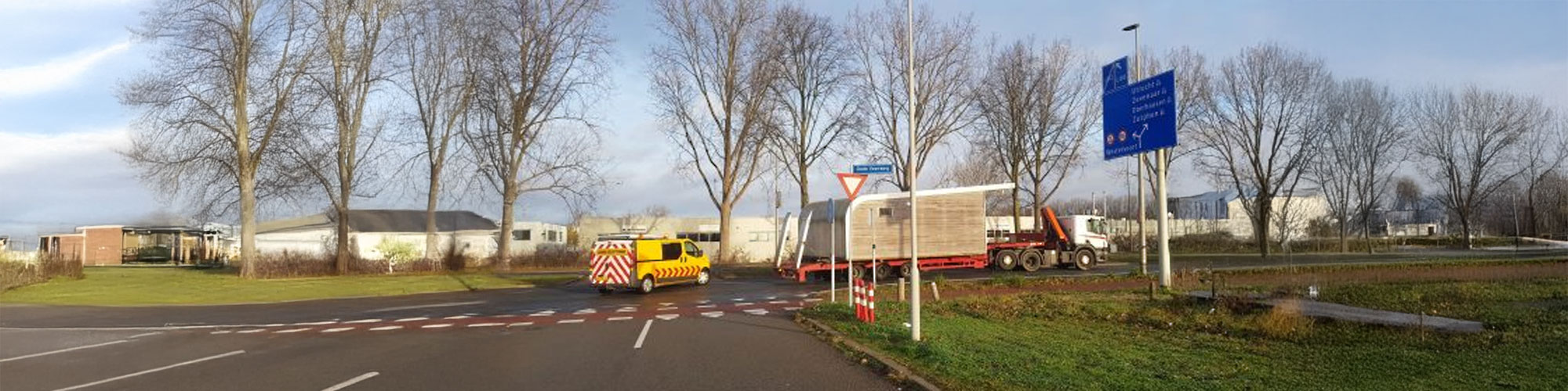 7 december 2018 | We doen graag bijzondere transporten. Zoals twee transporten vanaf het Industriepark Kleefse Waard (anno nu Cleantech Park Arnhem). In opdracht van een gewaardeerde klant mochten we het transport doen van enkele lodges, die waren dan wel 4.50 meter breed! Bijna tweemaal zo breed als een normale lading. Geen probleem. Maar om de lodge achter het woonhuis te krijgen, moest er wel iets speciaals bedacht worden; omladen op een wagen achter een landbouwtractor, een truck met een zware kraan, een lage oplegger mét begeleiding, een kettingzaag om een dampaal om te zagen en takken weg te halen zodat de kraan kon werken.